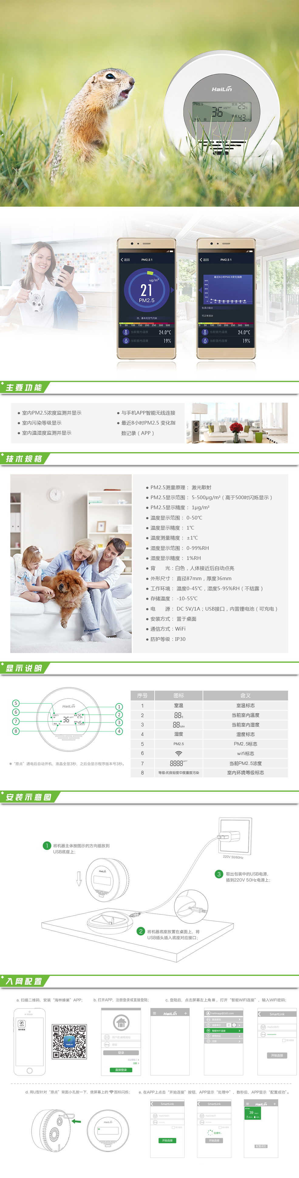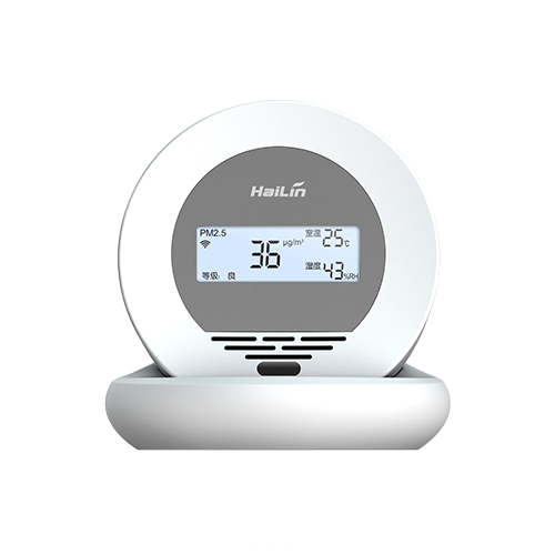“原點”一改傳統(tǒng)傳感器及控制器的工業(yè)造型,采用圓形外觀,以白色為主色調(diào),造型簡潔高雅;在確保對于室內(nèi)空氣PM2.5濃度、溫度及濕度探測同時,更實現(xiàn)了與室內(nèi)裝飾環(huán)境的完美融合。激光檢測原理對空氣中的PM2.5污染物進行檢測,并由微處理器對檢測數(shù)據(jù)進行運算;最終結(jié)果以數(shù)值及污染等級的方式顯現(xiàn),簡單直觀。帶WIFI通訊及紅外感應功能,采用USB電源供電,通過海林手機APP軟件可實時監(jiān)測室內(nèi)的PM2.5濃度,方便快捷。