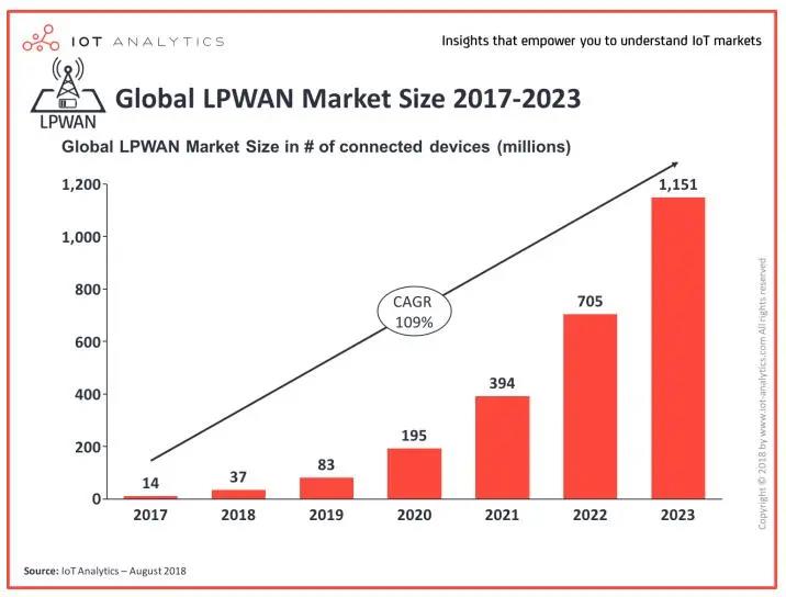 據(jù)預(yù)測,2017年至2023年LPWAN設(shè)備部署將大幅增長(如上圖所示),這表明LoRaWAN是物聯(lián)網(wǎng)連接領(lǐng)域快速增長的一部分,其中還包括快速增長的智能建筑市場。