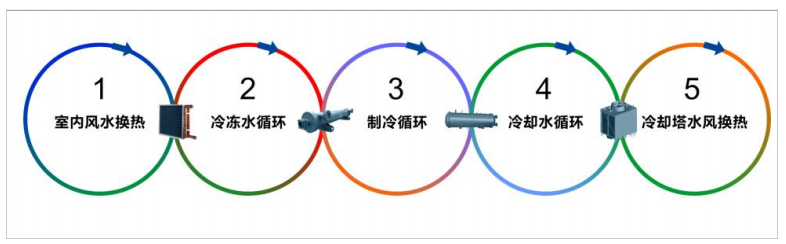 全面精細(xì)化實(shí)現(xiàn)高效制冷機(jī)房設(shè)計(jì),歸納于對(duì)五大循環(huán)系統(tǒng)的深入研判后的能效提升,它們分別是:1)室內(nèi)水風(fēng)循環(huán);2)冷水循環(huán);3)制冷循環(huán);4)冷卻水循環(huán);5)冷卻塔水風(fēng)換熱循環(huán),如下圖所示。其中與冷卻水系統(tǒng)節(jié)能直接相關(guān)的循環(huán)有冷卻水循環(huán)和冷卻塔風(fēng)水換熱循環(huán)。冷卻水循環(huán)涉及冷卻水供回水溫差;冷卻塔水風(fēng)換熱循環(huán)涉及冷卻塔供水溫度和室外濕球溫度的溫差,是為兩個(gè)溫差。