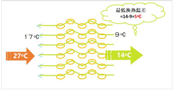 過(guò)去很長(zhǎng)的一段時(shí)間內(nèi)冷水系統(tǒng)大溫差的設(shè)計(jì)及其理論為暖通設(shè)計(jì)行業(yè)所耳熟能詳,相關(guān)論文闡述也很多,冷水大溫差多為降低冷水出水溫度,同時(shí)提高冷水回水溫度為代表(姑且叫第一類大溫差)如典型溫差為 7℃即 6-13℃循環(huán)溫度,末端采用吊裝空調(diào)箱的大型購(gòu)物中心項(xiàng)目,如筆者親身經(jīng)歷的合肥萬(wàn)科廣場(chǎng)購(gòu)物中心項(xiàng)目,見(jiàn)文獻(xiàn)[2]。這類大溫差的本質(zhì)是:在主機(jī)供水溫度(出水溫度低于 7℃)和既定溫差(溫差大于 5℃)下選型同時(shí)選擇能效比高的冷水泵,在滿足計(jì)算制冷量和規(guī)范的主機(jī)制冷量前提下,主機(jī)能耗的增加的數(shù)值小于水泵能耗的下降的數(shù)值,使得冷水循環(huán)側(cè)的主機(jī)和水泵的綜合能效最小。近年來(lái)出現(xiàn)的冷水側(cè)大溫差即中溫冷水機(jī)組的大溫差(姑且叫第二類大溫差),即通過(guò)改進(jìn)末端空調(diào)設(shè)備結(jié)構(gòu)形式,只要空調(diào)機(jī)組出風(fēng)干球溫度控制在≤14℃以下,系統(tǒng)可以提供不同的供回水溫度(供水溫度大于 7℃,回水溫度大于 12℃),冷水系統(tǒng)可以提供 9.5℃-14.5℃、8.8℃-14.8℃、8℃-15℃等不同的供回水溫度組合,如文獻(xiàn)三[3]中南京三山街大型購(gòu)物中心高效制冷機(jī)房的大溫差供回水溫度為 10℃-16℃;文獻(xiàn)四[4]提到的五邑大學(xué)教學(xué)樓高效制冷機(jī)房的供回水溫度為 10℃-18℃,當(dāng)然該項(xiàng)目較為特殊,是配合了改進(jìn)的末端(需要采用全新的中溫末端設(shè)備,從換熱能力、出風(fēng)溫度、風(fēng)側(cè)壓降、水側(cè)壓降等四個(gè)維度進(jìn)行全面優(yōu)化)及輔助電風(fēng)扇的采用,能達(dá)到所需要的溫濕度要求。因此第二個(gè)階段的冷水大溫差是提高供水溫度,同時(shí)提高供回水溫差的形式。下圖為中溫水大溫差的六排管逆流換熱圖。采用中溫變頻空調(diào)系統(tǒng)制冷機(jī)房某項(xiàng)目能效可達(dá)到 6.85。