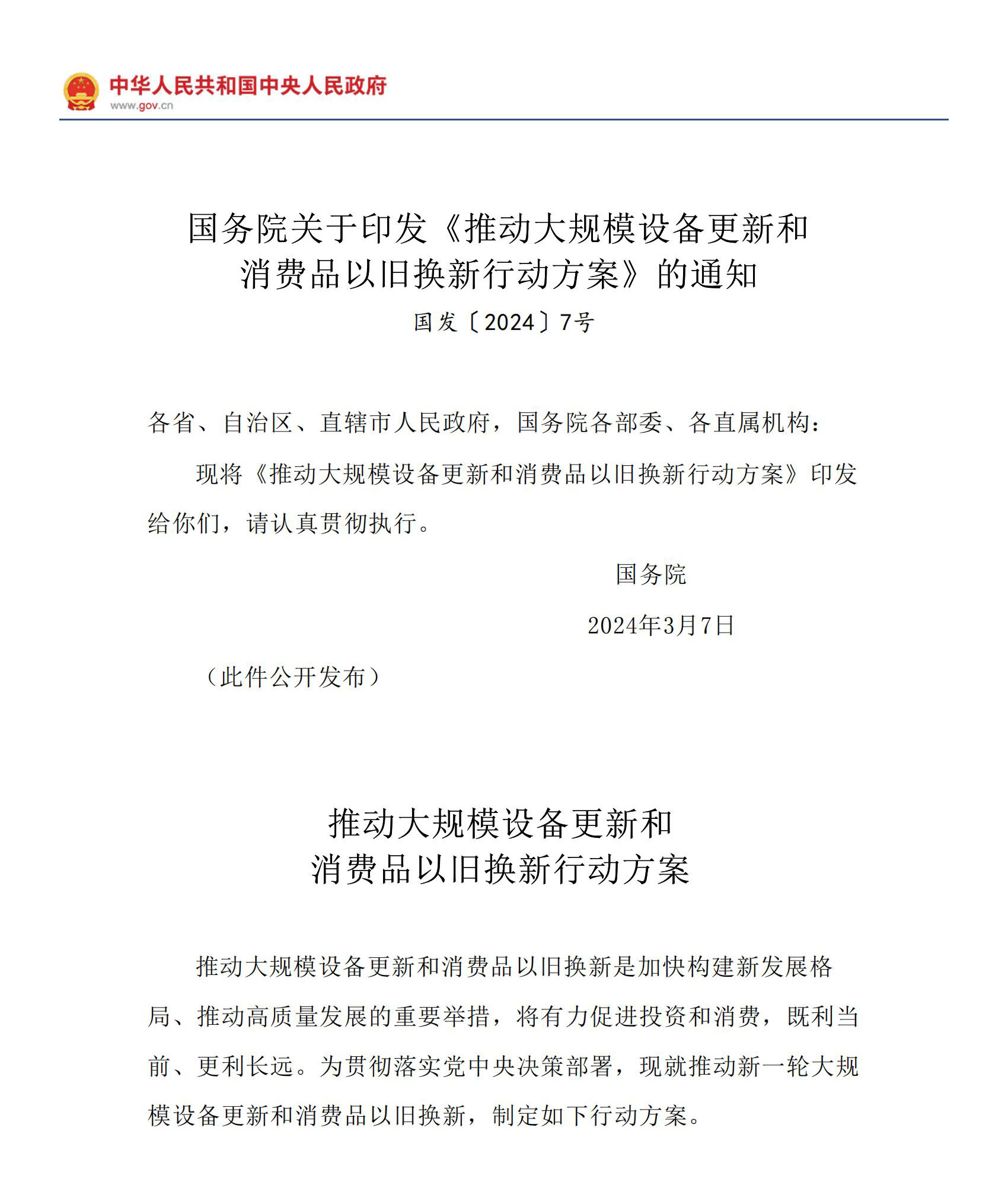 3月13日晚間,國務(wù)院正式印發(fā)《推動大規(guī)模設(shè)備更新和消費品以舊換新行動方案》。