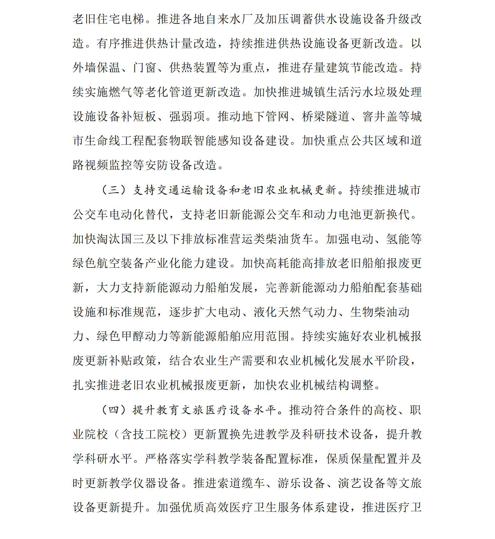 (二)加快建筑和市政基礎(chǔ)設(shè)施領(lǐng)域設(shè)備更新。圍繞建設(shè)新型城鎮(zhèn)化,結(jié)合推進(jìn)城市更新、老舊小區(qū)改造,以住宅電梯、供水、供熱、供氣、污水處理、環(huán)衛(wèi)、城市生命線工程、安防等為重點(diǎn),分類推進(jìn)更新改造。加快更新不符合現(xiàn)行產(chǎn)品標(biāo)準(zhǔn)、安全風(fēng)險(xiǎn)高的老舊住宅電梯。推進(jìn)各地自來(lái)水廠及加壓調(diào)蓄供水設(shè)施設(shè)備升級(jí)改造。有序推進(jìn)供熱計(jì)量改造,持續(xù)推進(jìn)供熱設(shè)施設(shè)備更新改造。以外墻保溫、門(mén)窗、供熱裝置等為重點(diǎn),推進(jìn)存量建筑節(jié)能改造。持續(xù)實(shí)施燃?xì)獾壤匣艿栏赂脑?。加快推進(jìn)城鎮(zhèn)生活污水垃圾處理設(shè)施設(shè)備補(bǔ)短板、強(qiáng)弱項(xiàng)。推動(dòng)地下管網(wǎng)、橋梁隧道、窨井蓋等城市生命線工程配套物聯(lián)智能感知設(shè)備建設(shè)。加快重點(diǎn)公共區(qū)域和道路視頻監(jiān)控等安防設(shè)備改造。