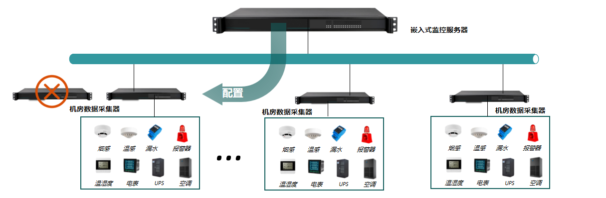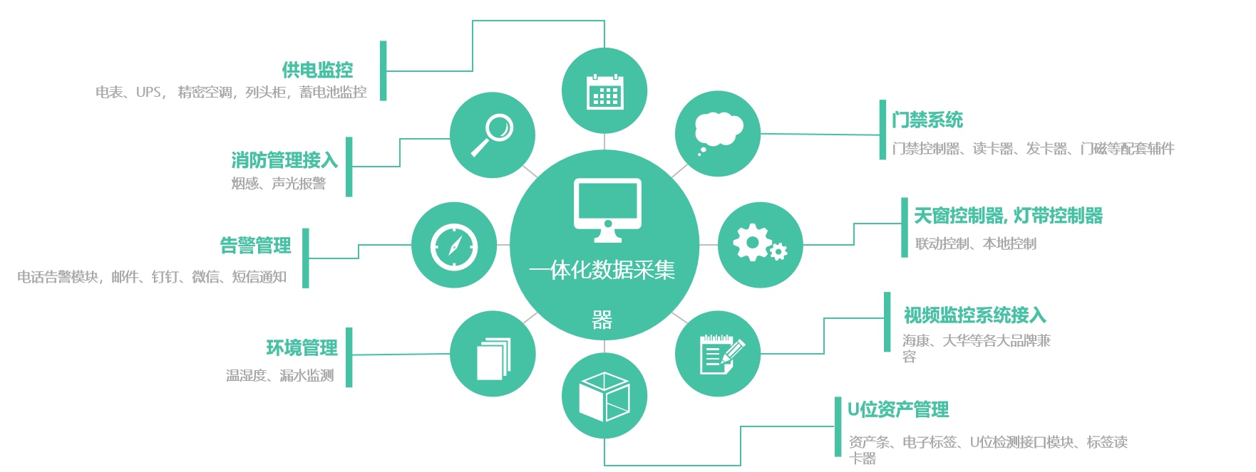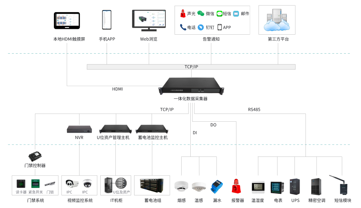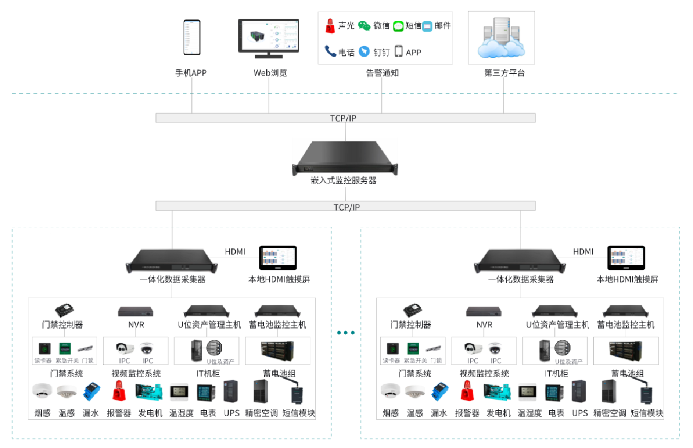 該系統(tǒng)由:嵌入式監(jiān)控服務器、一體化數(shù)據(jù)采集器、HDM觸摸屏、漏水監(jiān)測系統(tǒng)、天窗聯(lián)動控制器、蓄電池監(jiān)控系統(tǒng)、門禁控制系統(tǒng)、U位資產(chǎn)管理系統(tǒng)、溫濕度監(jiān)控系統(tǒng)組成