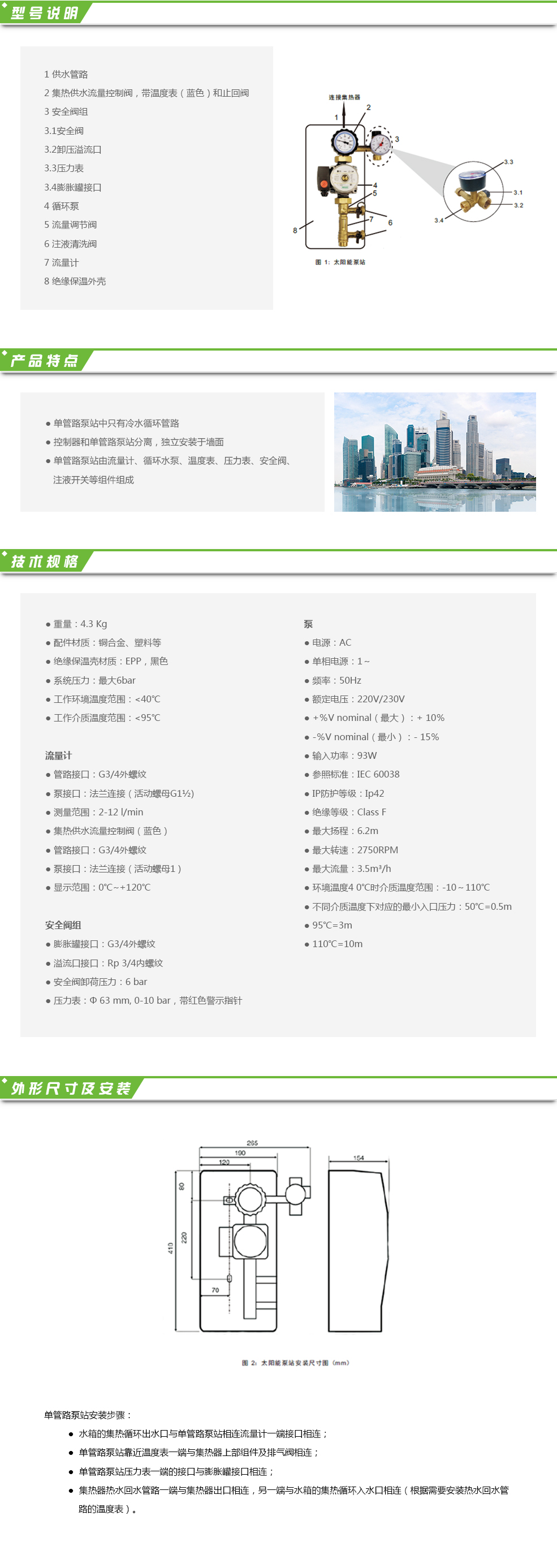 太陽能泵站HL-WS-01 用于分體承壓閉合的太陽能熱水系統(tǒng),安裝于太陽能集熱器的供水管路上,適用于水、水和乙二醇混合物介質(zhì),集成的安全閥組用于防止系統(tǒng)壓力過高。太陽能泵站包含功能性部件、安全保護裝置和絕緣保溫殼體;產(chǎn)品經(jīng)過集成裝配、嚴(yán)格的功能測試和密封性檢測。