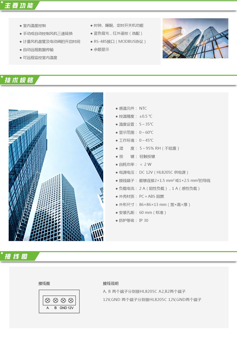 網(wǎng)絡(luò)型計(jì)時(shí)溫控器HL8205S適用于寫字樓、商業(yè)地產(chǎn)及家庭居室的溫度控制及對(duì)空調(diào)使用的計(jì)量計(jì)費(fèi)。其具備普通溫控器調(diào)節(jié)室內(nèi)溫度的功能,同時(shí)具有對(duì)風(fēng)機(jī)盤管的三速運(yùn)行時(shí)間、電動(dòng)閥的開(kāi)關(guān)時(shí)間進(jìn)行計(jì)量,并自動(dòng)遠(yuǎn)程傳輸數(shù)據(jù),也可通過(guò)集中控制遠(yuǎn)程監(jiān)控。