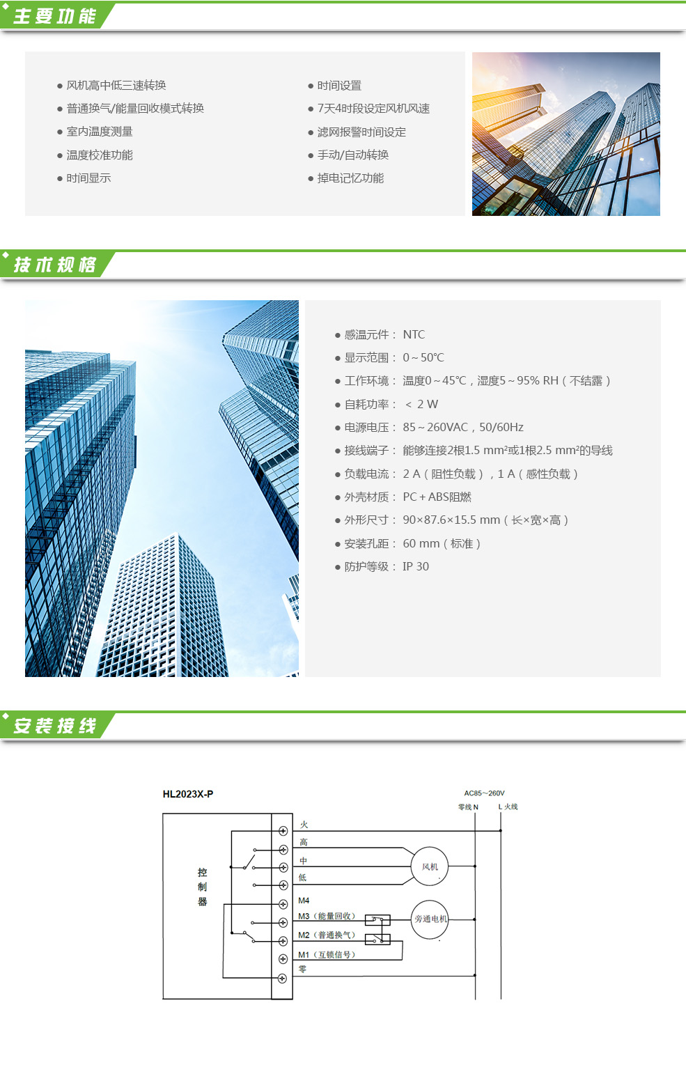 新風控制器HL2023X-P主要用于控制新風換氣機,設備包含一個單排機及一個旁通電機。通過控制器面板上的按鍵可以控制新風換氣機的啟停、速度的切換,手動/自動轉(zhuǎn)換,以及普通換氣與能量回收兩種工作模式的切換。