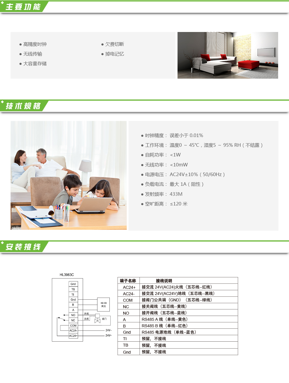 計量控制器HL3983C是應用于集中供熱采暖系統(tǒng)的智能控制器。對戶內采用無線通訊方式與室內溫控器進行通訊,RS485通訊方式與網(wǎng)關互聯(lián)??梢跃_計量閥門開啟時間,對室內溫度及設定溫度等參數(shù)精確計量和存儲。現(xiàn)場安裝極為簡單方便。 可與無線溫控器HL3983S或無線溫控器HL3963-S2配套使用。