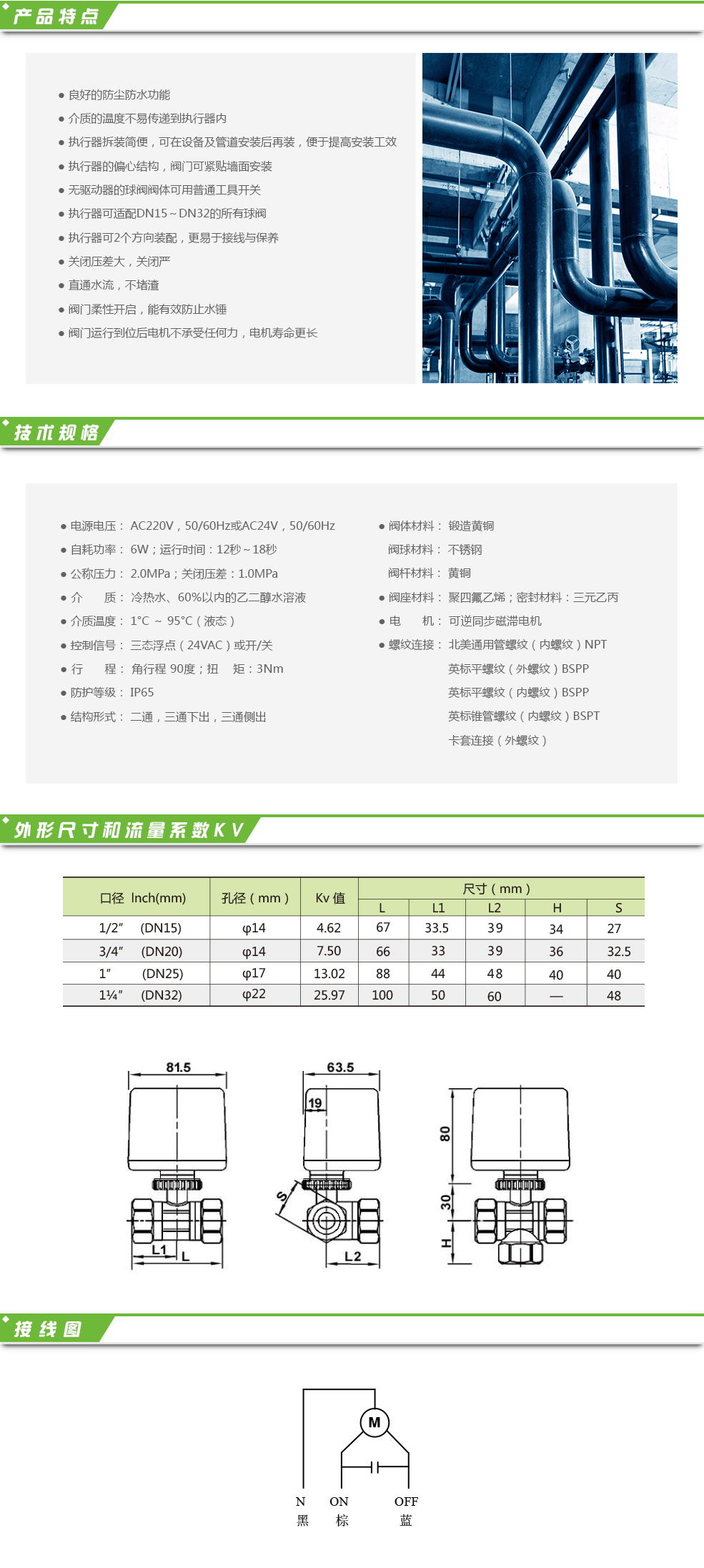 BV03系列電動(dòng)球閥主要用于中央空調(diào)冷熱水系統(tǒng),按實(shí)際需要精確控制冷、熱介質(zhì)的流量,不會(huì)造成溫度的劇烈變化,達(dá)到實(shí)時(shí)精確控制室溫之目的??刂崎y由雙向電機(jī)驅(qū)動(dòng),電機(jī)與溫控器通過(guò)公共端、開(kāi)啟端、閉合端鏈接。溫控器不斷采樣、處理現(xiàn)場(chǎng)數(shù)據(jù),發(fā)出控制信號(hào),令電動(dòng)球閥電機(jī)運(yùn)行或停止,控制電動(dòng)球閥的開(kāi)閉程度,冷水或熱水進(jìn)入風(fēng)機(jī)盤(pán)管,為房間提供冷氣或暖氣;當(dāng)室溫達(dá)到溫 ...