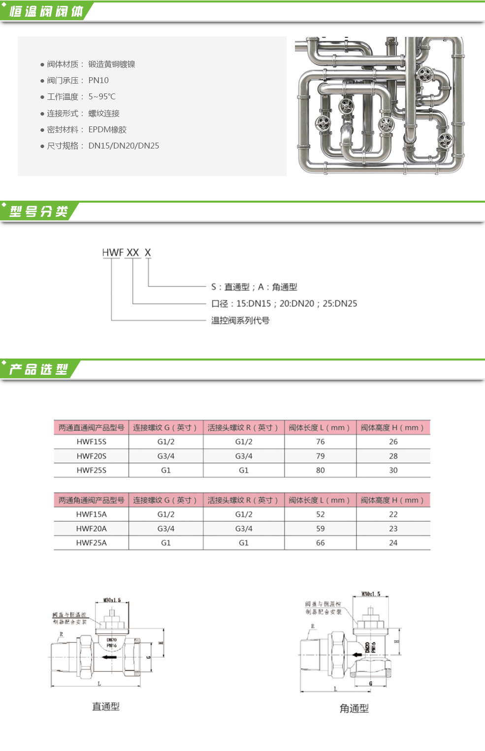 恒溫閥HWF是安裝在散熱器上的自動(dòng)控制閥門。與控制器T36配套使用能夠自動(dòng)感知環(huán)境溫度,并在不通過(guò)外力的情況下進(jìn)一步調(diào)節(jié)閥開(kāi)度,控制水流的大小,進(jìn)而維持房間溫度在設(shè)定溫度。海林溫控閥嚴(yán)格按照歐盟標(biāo)準(zhǔn)EN215進(jìn)行生產(chǎn),設(shè)計(jì)精巧,控溫精確,可滿足各種管網(wǎng)結(jié)構(gòu)的應(yīng)用。